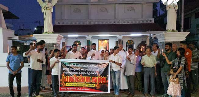 ഛത്തീസ്ഗഡില് മതപരിവര്ത്തനം നടത്തിയെന്ന് വ്യാജ ആരോപണം ഉന്നയിച്ച് മലയാളികളായ സിസ്റ്റര് പ്രീതി, സിസ്റ്റര് വന്ദന എന്നീ കന്യാസ്ത്രീകളെ അറസ്റ്റ് ചെയ്ത് ജയിലില് അടച്ചതിനെതിരെ എളമക്കര സെന്റ് ആന്റണീസ് പള്ളി വികാരി മോണ്സിഞ്ഞോര് ഫാ. ആന്റണി പെരുമായന്, ഫാ. കിരണ്, സിസ്റ്റര് ലിഥിയ, തോമസ് പള്ളിപ്പറമ്പില്, സൈജന് ചങ്കന് ഇടശ്ശേരി, അഡ്വ. സൈജി ജേക്കബ്ബ് പാലാട്ടി, ആന്റണി മാണിക്യത്ത് എന്നിവരുടെ നേതൃത്വത്തില് വിശ്വാസികള് പ്രതിഷേധ ജ്വാല നടത്തിയപ്പോള്.