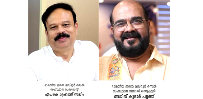 കൊച്ചി : ഭാരതീയ ജനത മസ്ദൂര്‍ സെല്ലിന്റെ (ബിജെഎംസി) സംസ്ഥാന പ്രസിഡന്റായി എം.കെ മുഹമ്മദ് സലീമും, ജനറല്‍ സെക്രട്ടറിയായി അജിത് കുമാര്‍ പട്ടത്തും ചുമതലയേറ്റു. ഭാരതീയ ജനതാ പാര്‍ട്ടിയില്‍ അഫിലിയേറ്റ് ചെയ്തിരിക്കുന്ന ബിജെഎംസി അസംഘടിത തൊഴിലാളികള്‍, കരാര്‍ ജീവനക്കാര്‍ തുടങ്ങിയവരുടെ അവകാശങ്ങള്‍ക്കും ക്ഷേമത്തിനും വേണ്ടി പ്രവര്‍ത്തിക്കുന്ന ദേശീയ സംഘടനയാണ്. കൊച്ചി കച്ചേരിപ്പടി ഹോട്ടല്‍ കിംഗ് എംബയറില്‍ ദേശീയ ചെയര്‍മാന്‍ ബിശ്വാപ്രിയ റോയ് ചൗധരിയുടെ അധ്യക്ഷതയില്‍ കൂടിയ യോഗത്തിലാണ് സംസ്ഥാന നേതാക്കള്‍ ചുമതലയേറ്റത്. ചടങ്ങില്‍ ദേശീയ പ്രസിഡന്റ് അര്‍ണബ് ചാറ്റര്‍ജി, മഹിളാ വിംഗ് ദേശീയ പ്രസിഡന്റ് മുനാവാരി ബീഗം, നാഷണല്‍ വൈസ് പ്രസിഡന്റ് ദീപക് ശര്‍മ്മ, യൂത്ത് വിംഗ് ദേശീയ പ്രസിഡന്റ് അര്‍മാന്‍ ഗാംഗുലി, തമിഴ്‌നാട് മൈനോരിറ്റി സെല്‍ വൈസ് പ്രസിഡന്റ് ബിജു അലക്‌സ് തുടങ്ങിയവരും പങ്കെടുത്തു.