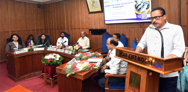 കൊച്ചി: തൊഴിലായ്മ നേരിടുന്നവര്ക്കും പത്താം ക്ലാസ് പ്ലസ് ടു യോഗ്യതയുള്ള യുവാക്കള്ക്കും തൊഴില് അവസരങ്ങളിലേക്ക് വഴികാട്ടുവാന് അപ്രന്റിസ്ഷിപ്പ് അവബോധ ശില്പശാല സംഘടിപ്പിച്ച് ഐസിഎആര്-സി.ഐ.എഫ്.ടി കൊച്ചി. സീഫുഡ് എക്സ്പോര്ട്ടേഴ്സ് അസോസിയേഷന് ഓഫ് ഇന്ത്യ കേരള റീജിയന് പ്രസിഡന്റ് എം.ആര്. പ്രേമചന്ദ്ര ഭട്ട് ശില്പ്പശാല ഉദ്ഘാടനം ചെയ്തു. തൊഴില് സൃഷ്ടിക്കാനും വ്യവസായങ്ങള്ക്ക് കഴിവുറ്റ മാനവശേഷി ഒരുക്കാനും അപ്രന്റിസ്ഷിപ്പ് പദ്ധതികള് നിര്ണായകമാണെന്ന് എം.ആര്. പ്രേമചന്ദ്ര ഭട്ട് ഉദ്ഘാടന പ്രസംഗത്തില് വ്യക്തമാക്കി.