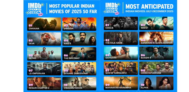 ലോകമെമ്പാടുമുള്ള 25 കോടിയിലധികം വരുന്ന ഐഎംഡിബി ഉപയോക്താക്കളുടെ യഥാര്ഥ പേജ് വിസിറ്റിനെ അടിസ്ഥാനമാക്കിയാണ് പട്ടിക തയ്യാറാക്കിയിരിക്കുന്നതെന്ന് ഐഎംഡിബി അറിയിച്ചു. ഡ്രാഗണ്, ദേവ, റെയ്ഡ് 2, റെട്രോ, ദി ഡിപ്ലോമാറ്റ്, സിതാരെ സമീന് പര്, കേസരി ചാപ്റ്റര് 2: ദി അണ്ടോള്ഡ് സ്റ്റോറി ഓഫ് ജാലിയന്വാലാ ബാഗ്, വിടാമുയര്ച്ചി എന്നിവയാണ് 2025ല് ഇതുവരെ തിയേറ്ററുകളില് തരംഗം സൃഷ്ടിച്ച ഇന്ത്യന് സിനിമകളുടെ പട്ടികയില് ആദ്യ പത്തിലുള്ളത്. 2025 ജനുവരി 1 മുതല് 2025 ജൂലൈ ഒന്ന് വരെ ഇന്ത്യയില് പുറത്തിറങ്ങിയ സിനിമകളില്, 10,000ല് കുറയാത്ത വോട്ടുകളോടെ ആറോ അതില് കൂടുതലോ ശരാശരി ഐഎംഡിബി ഉപയോക്തൃ റേറ്റിങ് നേടിയ ചിത്രങ്ങളെയാണ് പട്ടികയിലേക്ക് പരിഗണിച്ചത്. വാര് 2, ദി രാജാ സാബ്, ആംഖോം കി ഗുസ്താഖിയാം, സൈയാറ, ബാഗി 4, സണ് ഓഫ് സര്ദാര് 2, ഹൃദയപൂര്വം, മഹാവതാര് നരസിംഹ, ആല്ഫ എന്നിവയാണ് 2025 ജൂലൈഡിസംബര് കാലയളവില് പ്രേക്ഷകര് ഏറ്റവും കൂടുതല് പ്രതീക്ഷയോടെ കാത്തിരിക്കുന്ന ഇന്ത്യന് സിനിമകളുടെ ആദ്യ പത്തില് ഇടം നേടിയത്. മോഹന്ലാല്, അജയ് ദേവ്ഗണ്, പൂജ ഹെഗ്ഡെ എന്നിവരാണ് രണ്ട് പട്ടികകളിലും ഇടം നേടിയ സിനിമകളുടെ ഭാഗമായ താരങ്ങള്. സിനിമകള്, ടിവി ഷോകള്, സെലിബ്രിറ്റികള് എന്നിവയെക്കുറിച്ചുള്ള വിവരങ്ങള്ക്ക് ലോകത്തിലെ ഏറ്റവും ജനപ്രിയവും ആധികാരികവുമായ ഉറവിടമാണ് ഐഎംഡിബി.